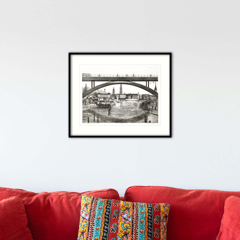 Between Långholmen and Södermalm lies Pålsundet. The steel arch of Västerbron is reflected in the strait, forming an oval that frames boathouses and the classic buildings of the Old Town.