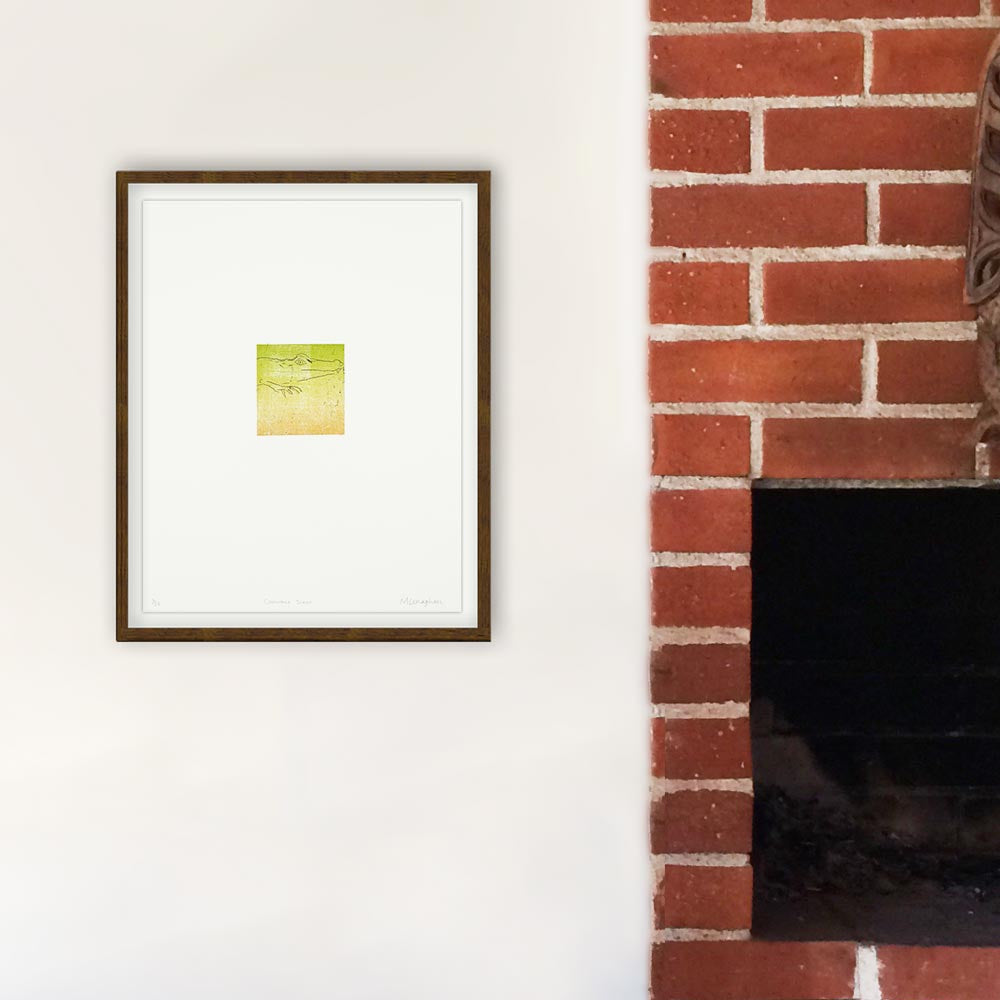 Detta tryck är en etsning med chine-collé, vilket betyder att ett mycket tunt papper fästs bakom den tryckta bilden på papperet.