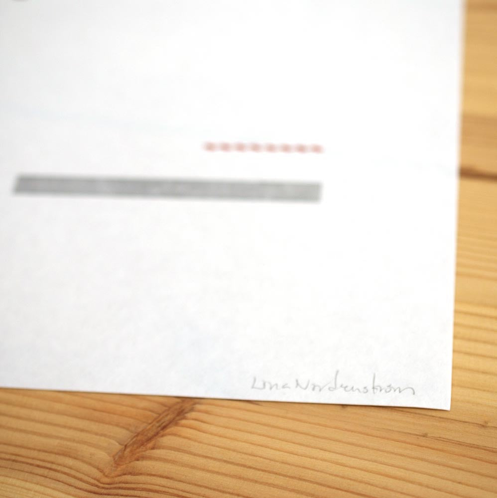 Lina Nordenström intresserar sig för tryck av alla de slag. Alla former som denna serie tryck är byggda av, är hämtade från boktryckarkonsten – ett streck kan exempelvis vara ett infärgat radavstånd.