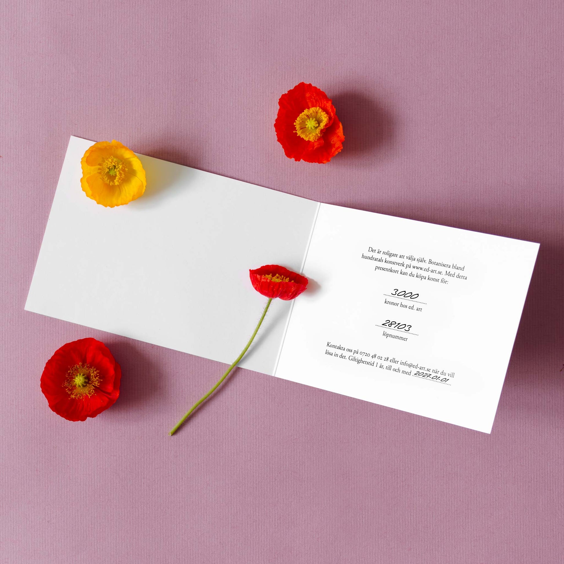 Presentkortet är giltigt i ett år och kan användas både här på webben och i vårt galleri på Timmermansgatan i Stockholm. Det gäller både på konstverk och inramningar av dessa, men inte på enbart ramar.